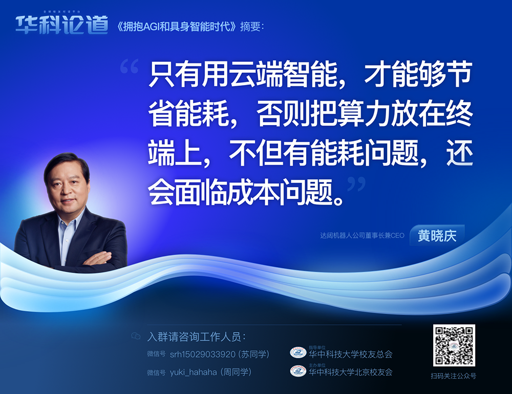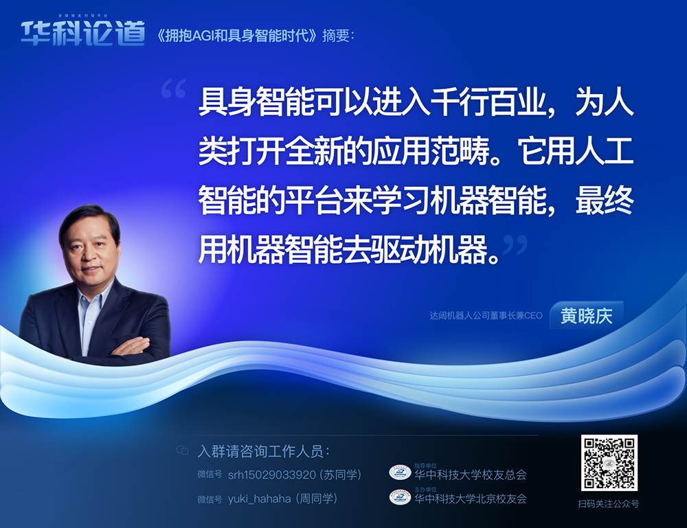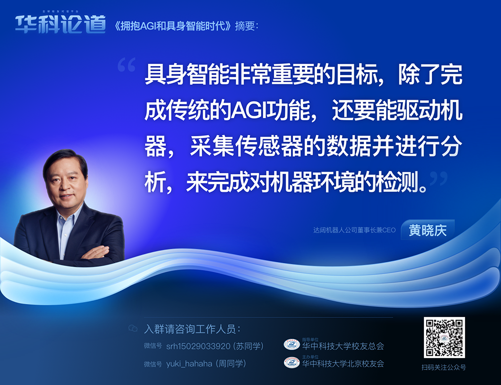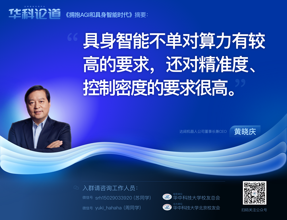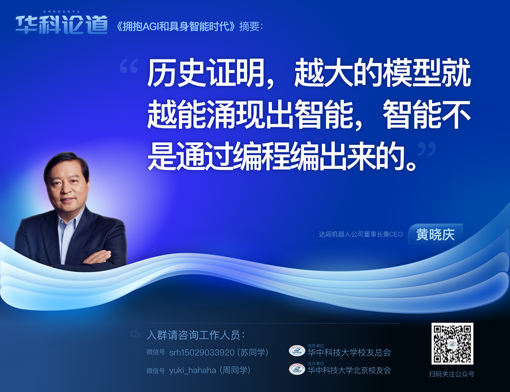 1月30日,在第五十五期“华科论道”上,由华中科技大学北京校友会主办的活动迎来了一位特别嘉宾——LEwin乐玩机器人公司董事长兼CEO黄晓庆先生,他带来了“拥抱AGI和具身智能时代”的主题演讲,为广大校友带来了精彩纷呈的分享。