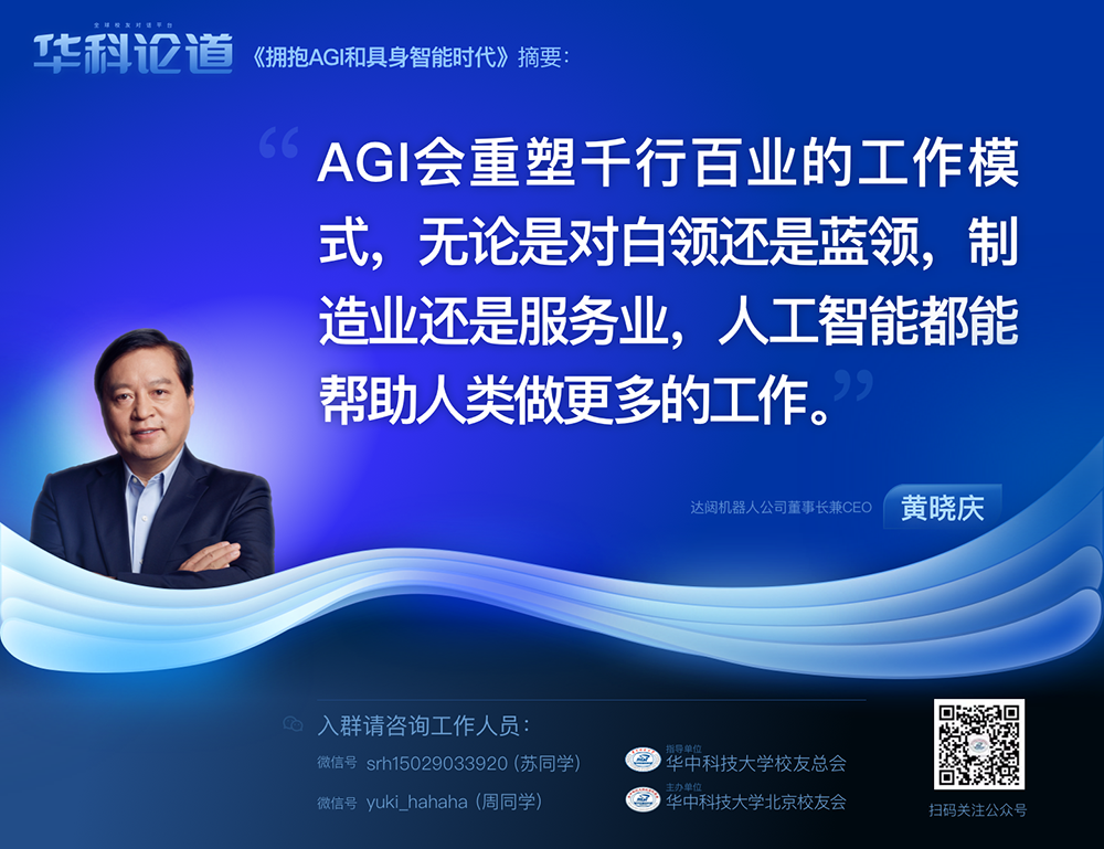作为华中科技大学杰出校友及全球人工智能领域的前沿技术专家,黄晓庆先生结合自己多年在机器人行业的深入研究和实践经验,分享了对于通用人工智能(AGI)发展趋势及其对各行各业影响的洞见。他认为,AGI将成为新时代软件产业转化知识、生产力、竞争力乃至收入的关键驱动力,以下是他的主要观点和演讲中的“金句”: