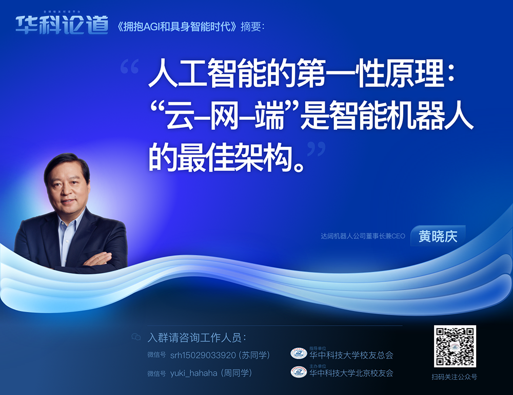 作为华中科技大学的杰出校友,黄晓庆凭借其在人工智能领域的深厚积累和全球视野,为校友们提供了宝贵的思考和启示。在演讲中他展示了面向未来的思维,也体现出他对认准的方向有魄力去追求和实现的毅力。他的分享为未来具身智能机器人与社会发展的融合提供了新方向,也为人形机器人技术的发展方向提供了新思路。华科论道活动一直致力于为校友搭建知识交流平台,推动科技创新与社会发展,此次活动再次彰显了其价值与使命。
